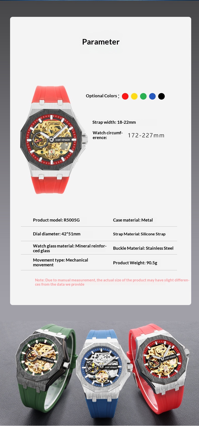 Color: Silver case with black tape R5005G-S02-1, silver bezel with black ring and red tape R5005G-S02-2, black bezel with rose gold ring and black tape R5005G-S02-3, silver case with blue tape R5005G-S02-4, black case with green tape R5005G-S02-5
